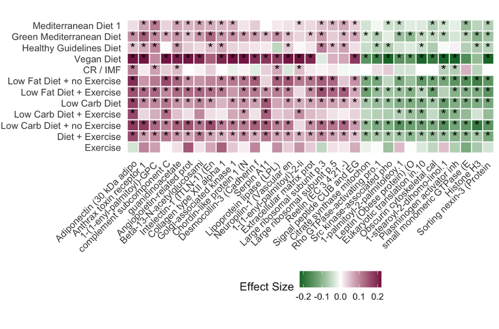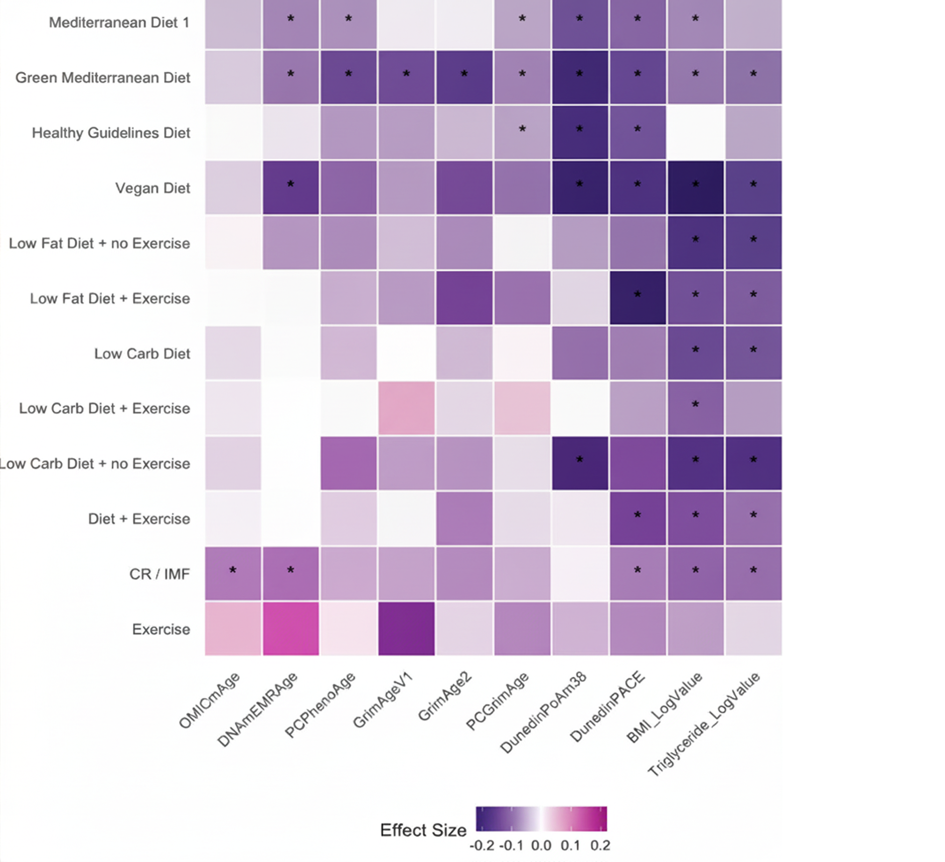 TruDiagnostic conducted a large-scale meta analysis, spanning 11 distinct eating plans using multiple epigenetic aging clocks, shown in the heatmap below.